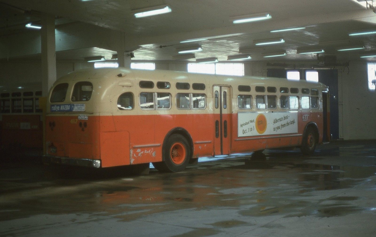 Edmonton Transit System GMC Transit Bus number 412 inside garage at Edmonton, MA. Taken - 12/1974.