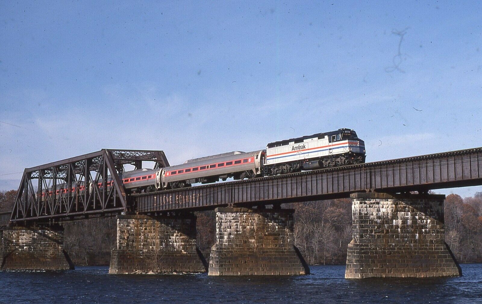 Amtrak EMD F40PH number 265 leads consist of Shore Line East de-powered SPV2000 crosses Connecticut River at Enfield, CT. Taken - 11/26/1995.