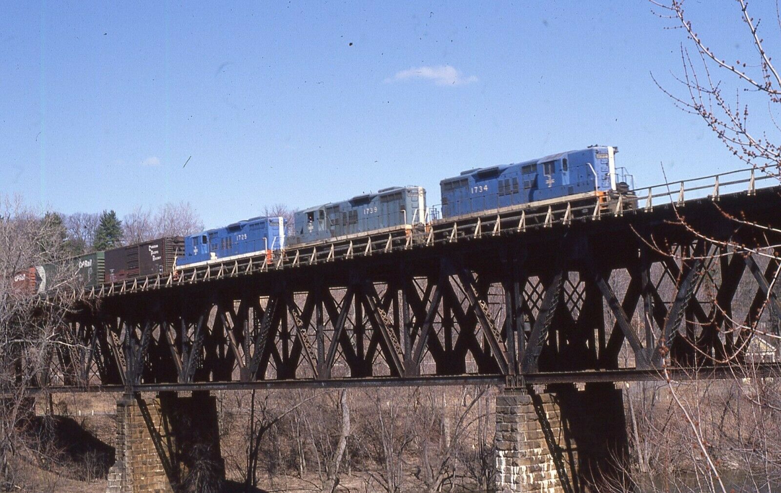 Boston & Maine EMD GP9 Trio with number 1734-1739-1725 lead freight across river at Greenfield, MA. Taken - 03/18/1979.