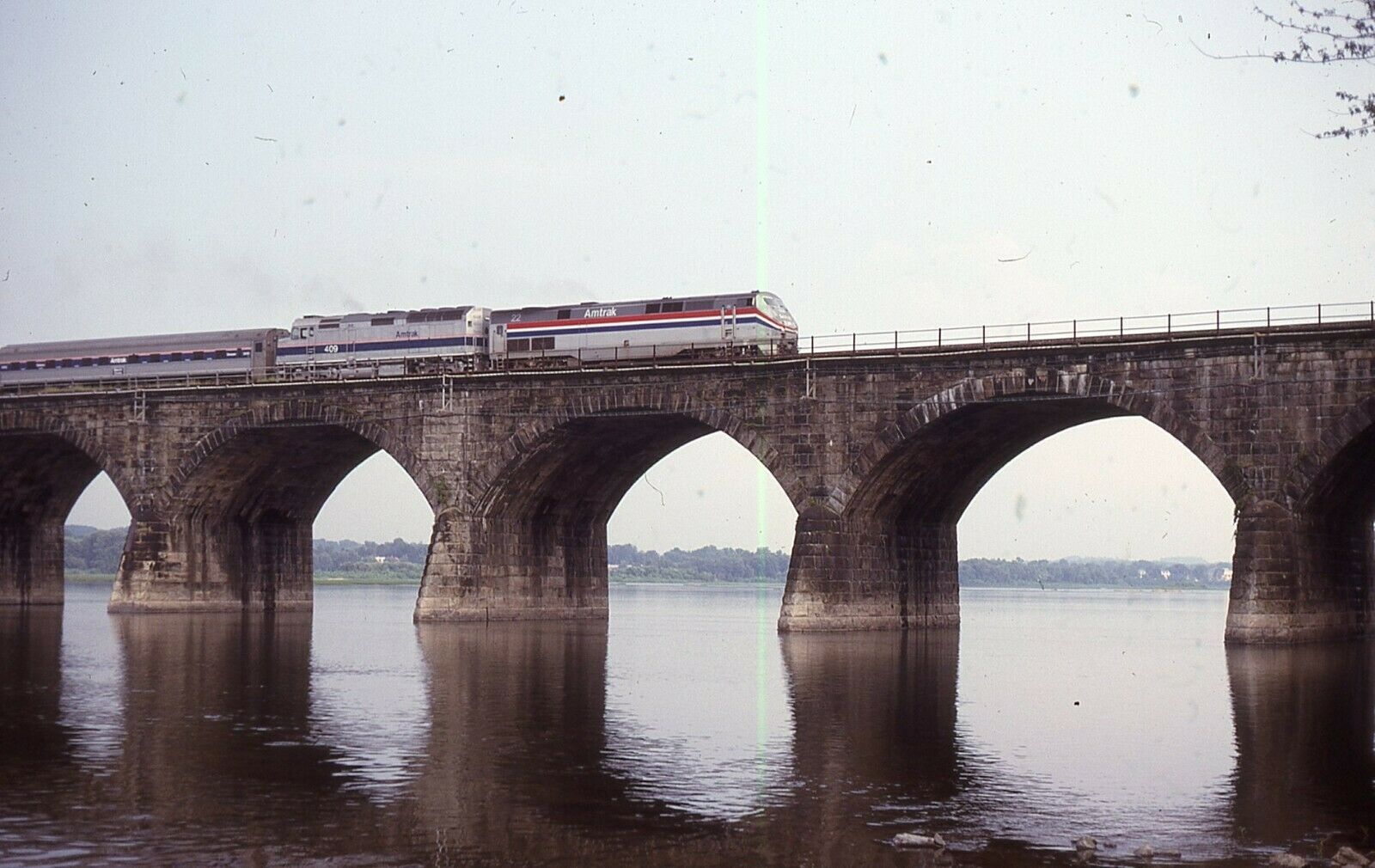 Amtrak GE P42DC number 22 leads train across Rockville Viaduct outside Harrisburg, PA. Taken - 07/21/2000.