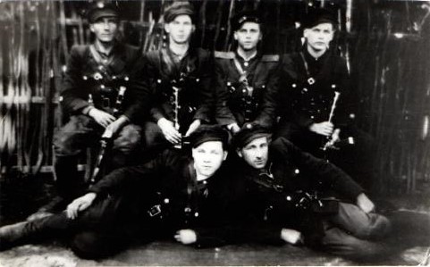 Cидять зліва направо: Коник Михайло Якович "Орел", Бунковський Іван Іванович "Ганс", Кравець Юрко "Дунай", Гошовський Михайло Васильович "Максим". Лежать зліва направо: Долішній Богдан Васильович "Боян", Пастух Прокіп Лук'янович "Зеновій".
