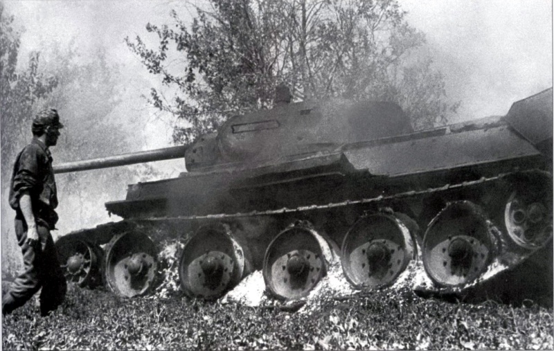 Немецкий солдат рядом с подбитым и горящим советским танком Т 34