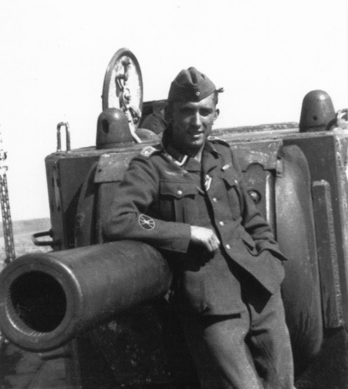 Немецкий солдат в звании оберфельдфебеля фотографируется, оперевшись на ствол брошенного советского танка КВ 2. Виден нарукавный знак радиотехника.