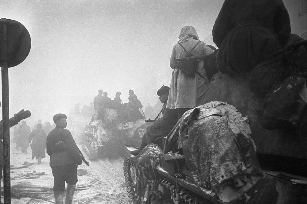 Советские войска на зимнем марше. По дороге идёт колонна САУ СУ-76.