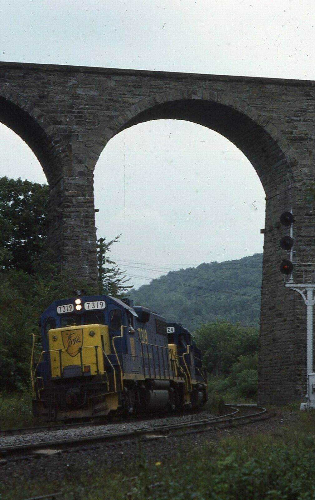 D&H EMD number 7319 leads train under Srurrucca Viaduct at Lanesboro, PA. Taken - 08/30/1978.