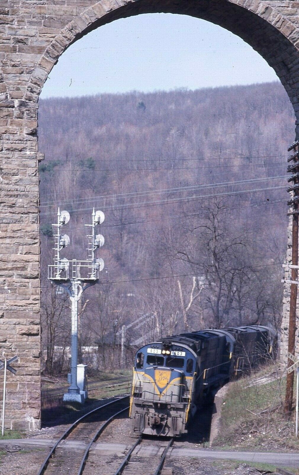 Delaware & Hudson Alco C628 number 603 leads train under Starruca Viaduct at Lansdale, PA. Taken - 05/03/1975.