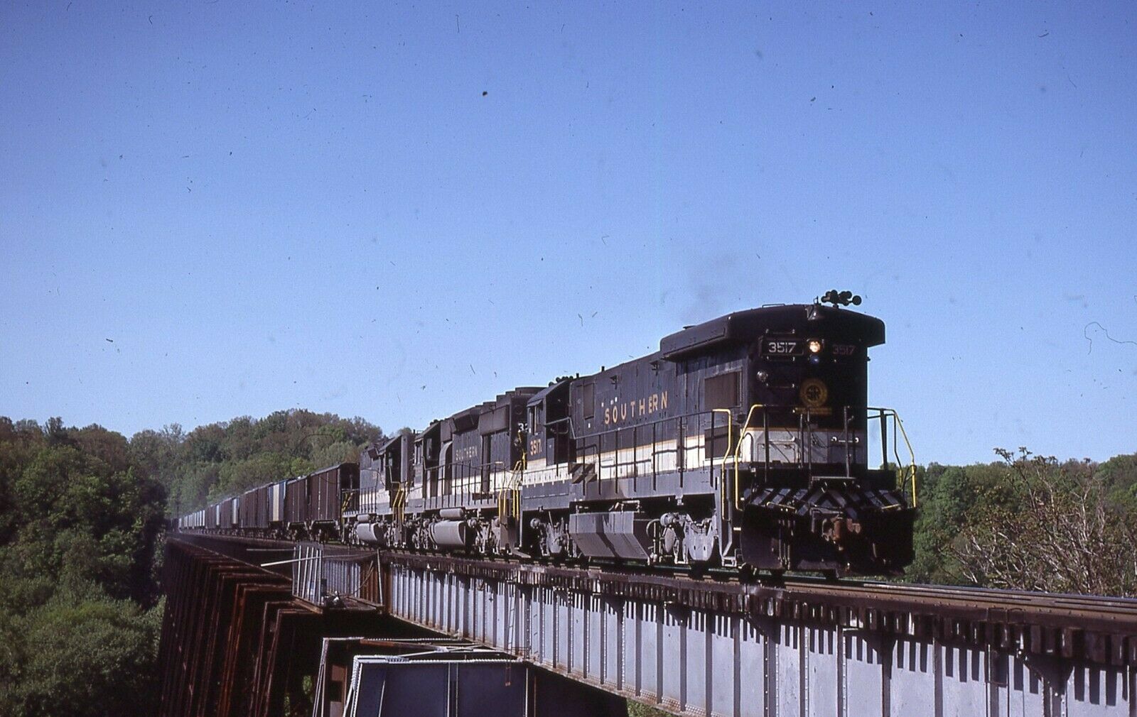 Southern Railway GE number 3517 keads train across high trestle at Lynchburg, VA. Taken - 05/04/1985.