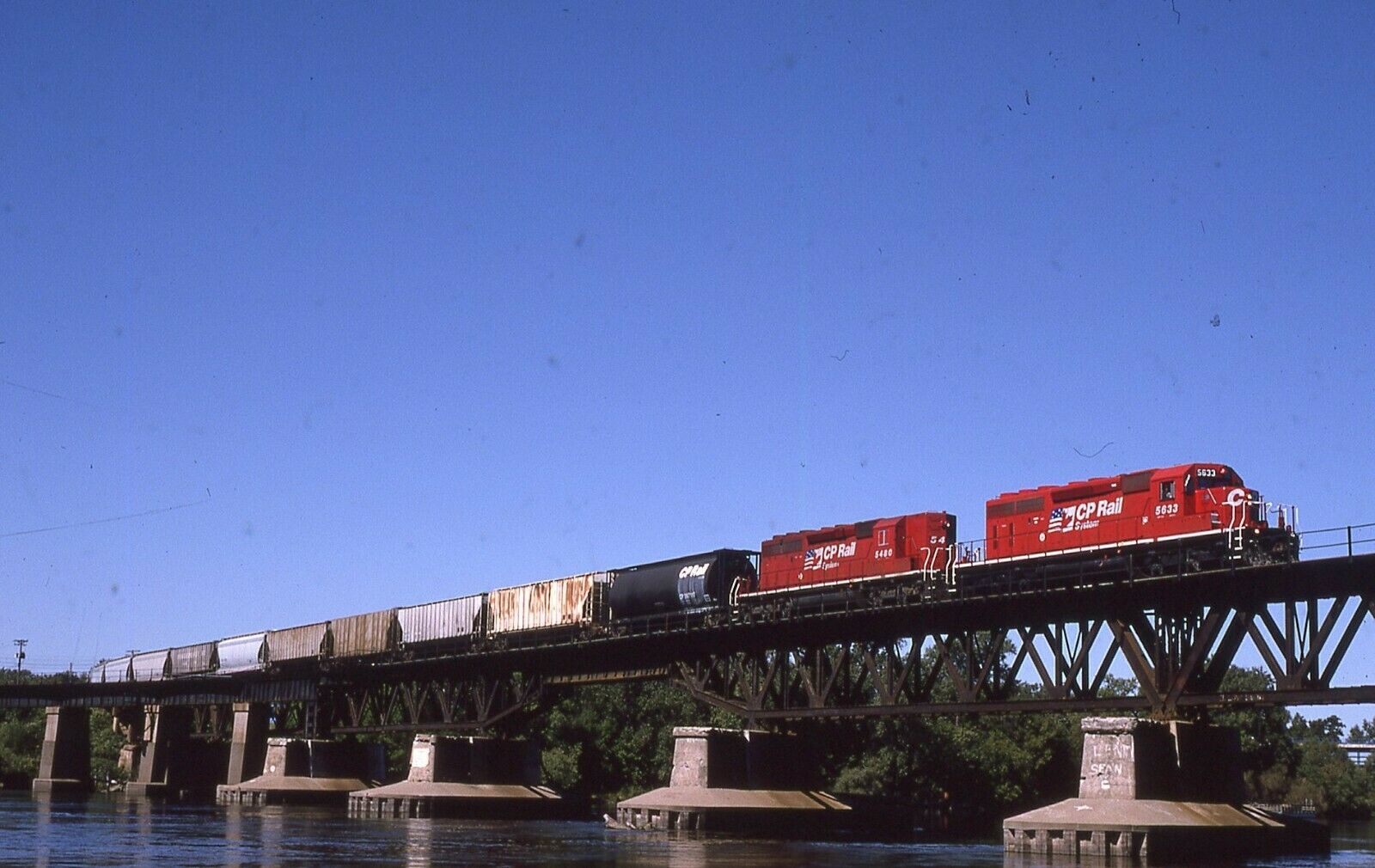 Canadian Pacific GMD Duo number 5633-5480 cross trestle at Minneapolis, MN. Taken - 09/1995.