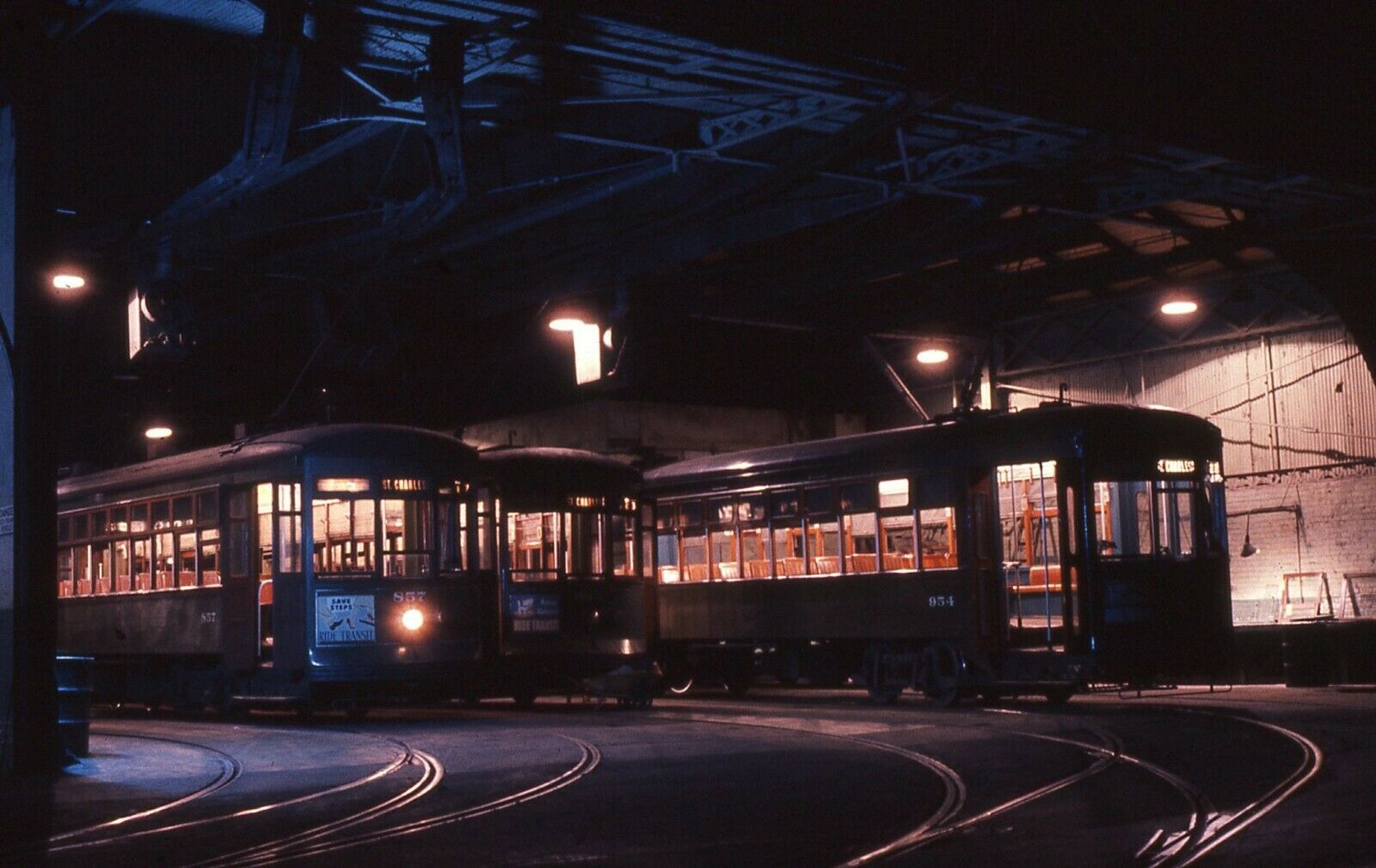 New Orleans Public Service Trolleys line up at night at New Orleans, LA. Taken - 08/29/1963.
