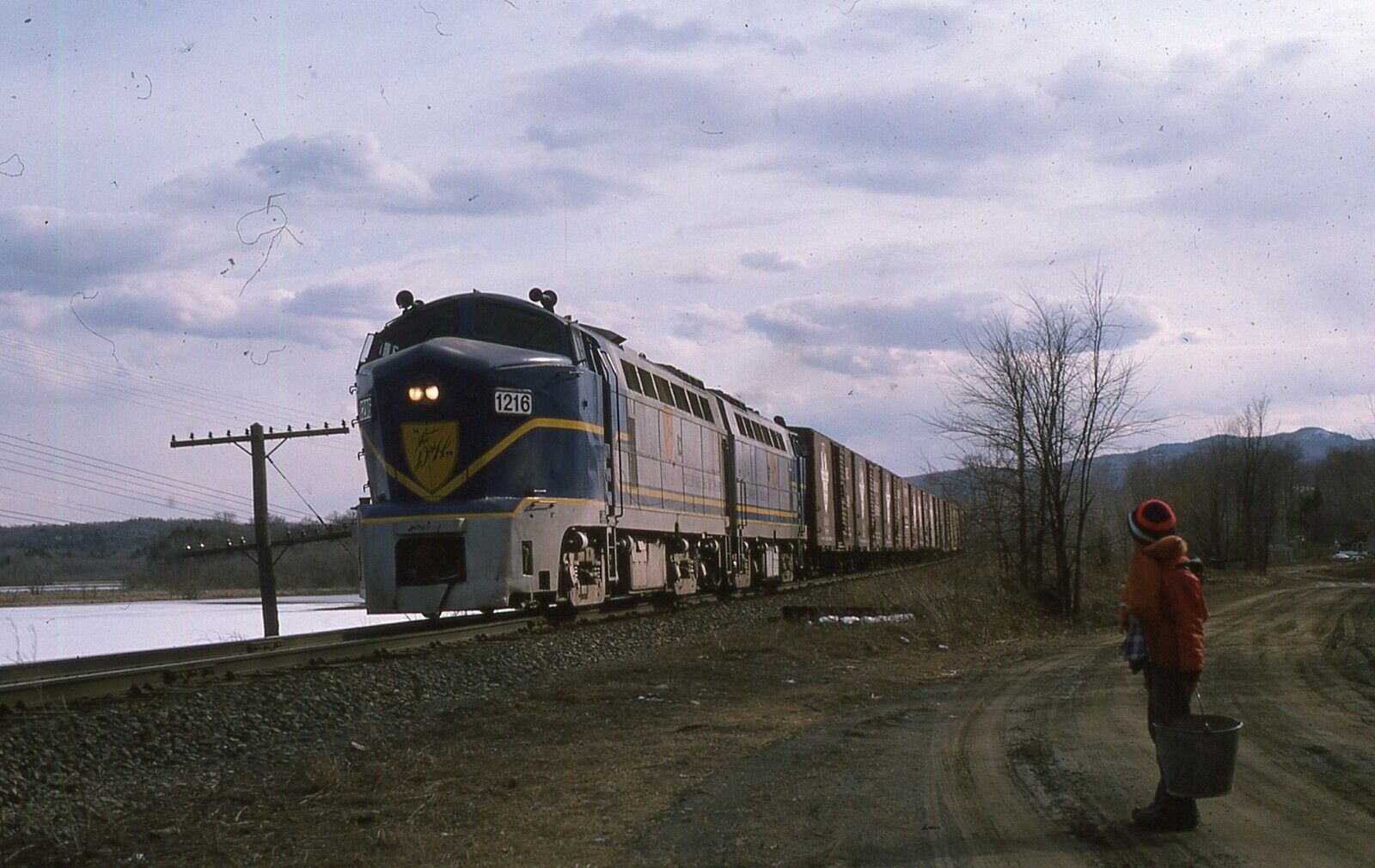 D&H Baldwin RF16 duo with number 1216-1205 lead freight at location not named at NY. Taken - 04/12/1975.