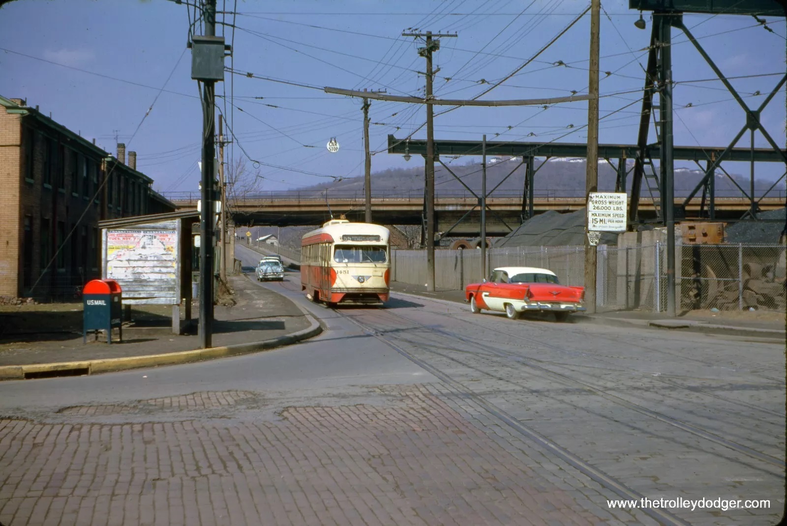 Subject: PRC Pittsburgh Railways PCC Streetcar #1451 Location: Pittsburgh, Pennsylvania (Route 55 - Hays Station) Date: March 20, 1962 Photographer: Jeffrey L. Wien