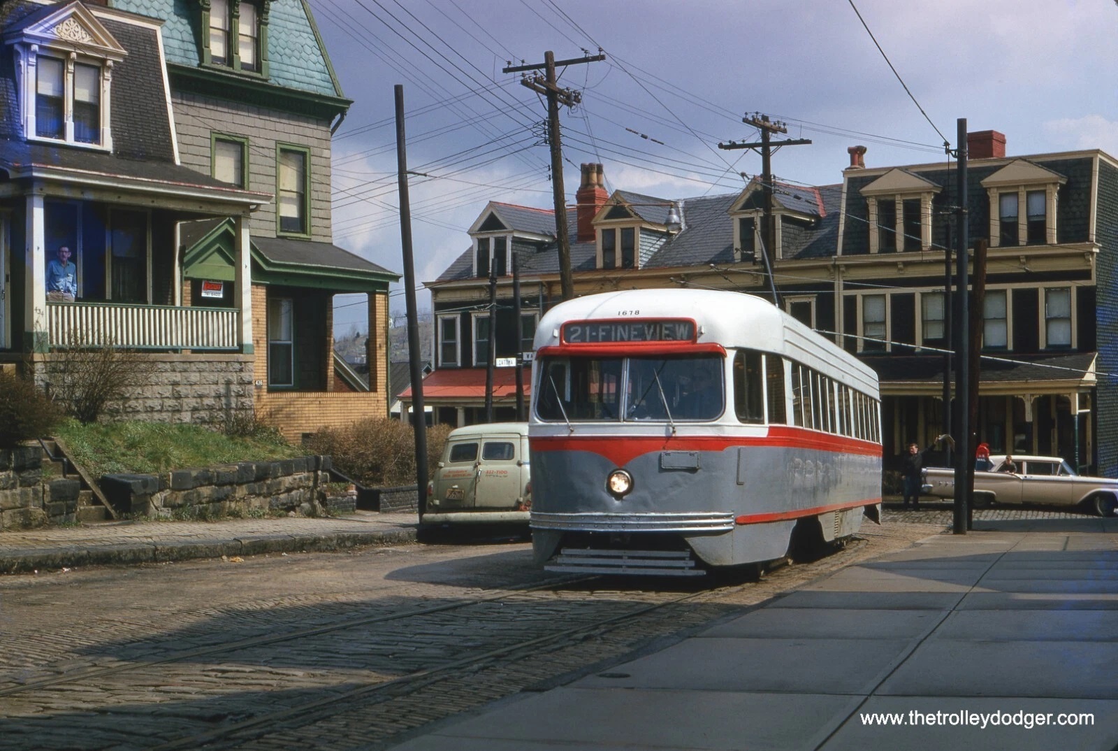 Subject: PRC Pittsburgh Railways PCC Streetcar #1678 Location: Pittsburgh, Pennsylvania (Catoma at Warren - Route 21 - Fineview) Date: April 9, 1966