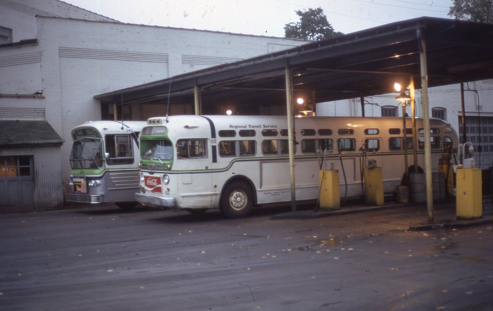 Regional Transit Services Transit Buses number 102 and 542 at Rochester, NY. Taken - 01/1972.