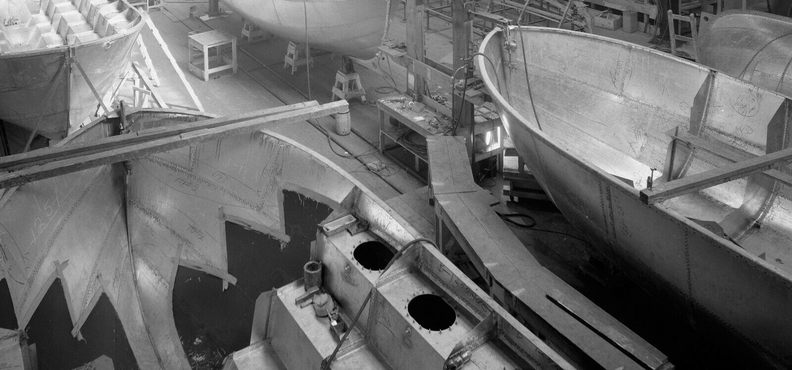 Lifeboat Production for War Effort. likely: San Francisco, California. October 16, 1942. Photographer: Moulin Studios