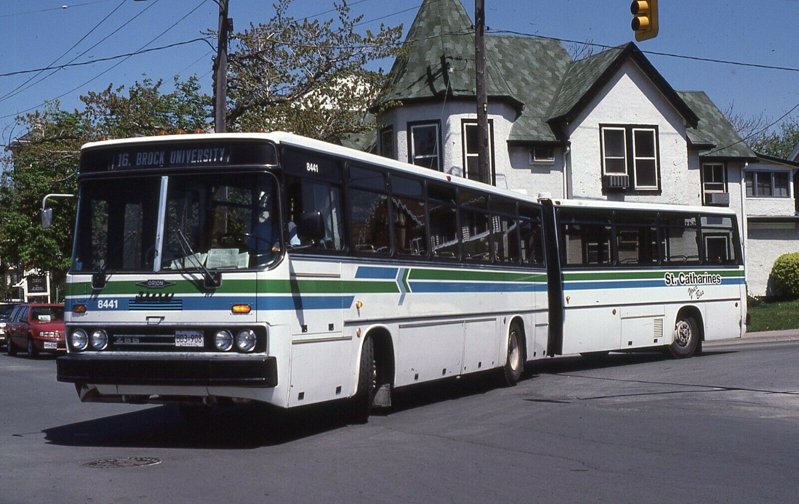 St. Catherines Transit Orion Articulated Transit Bus number 8441 at St. Catherines, ON. Processed - 06/1988.