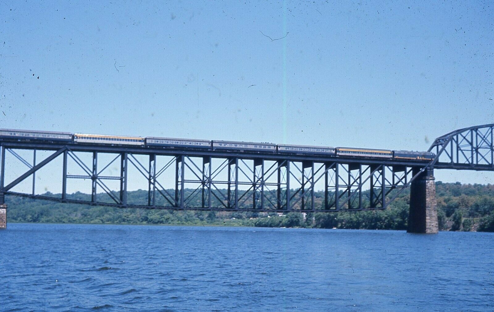 B&O EMD E8 leads train across Susquehanna River at location not named. Processed - 07/1966.