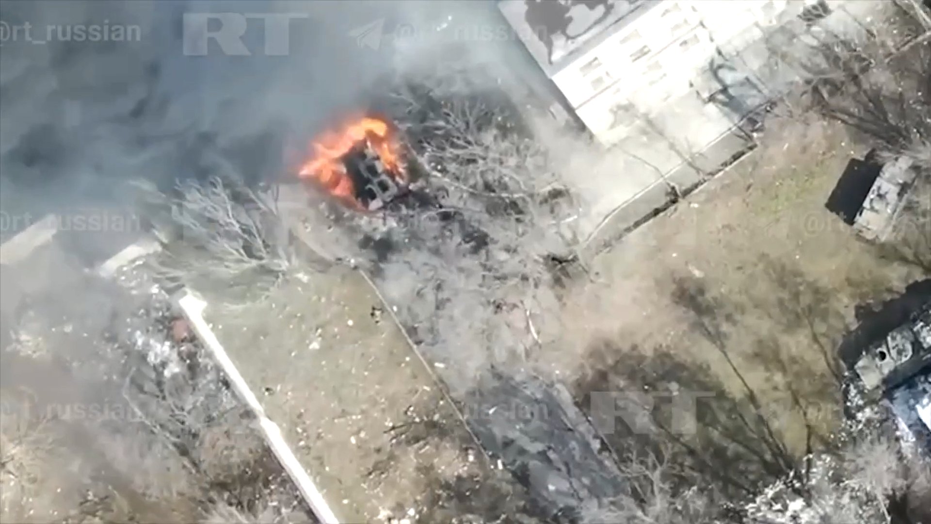 "Март 2022, Мариуполь. Съемка со стороны противника, который бьет по технике возле того самого дома, где оборону в течении нескольких суток держали отряд 346-й ОБрСпН и 810-й бригады морской пехоты."(С)