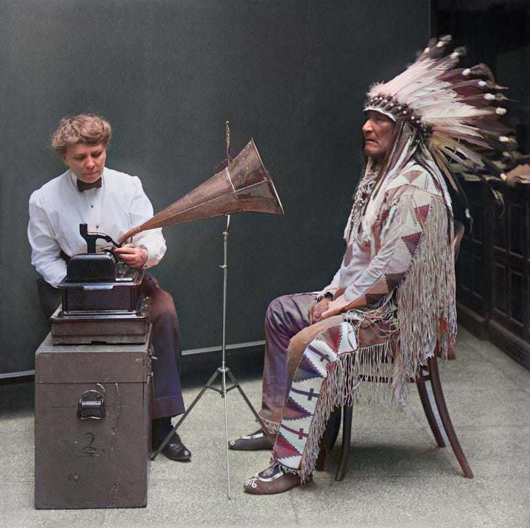 Этнограф Фрэнсис Дансмур производит фонографическую запись вождя черноногих Mountain Chief, 1916