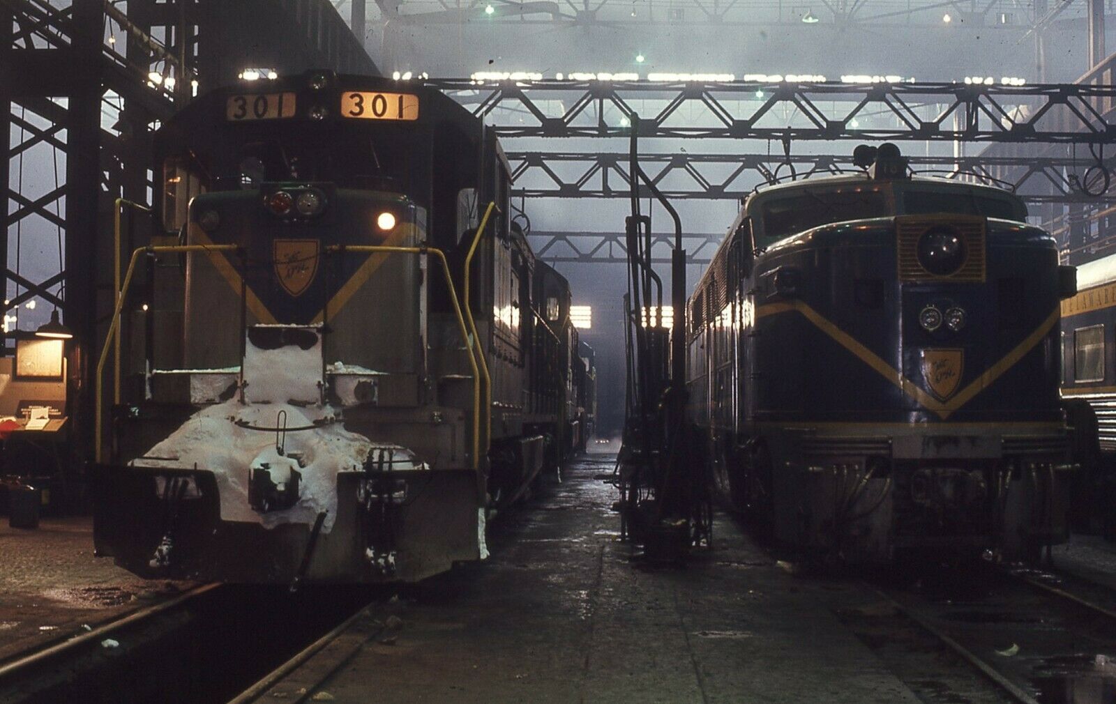 D&H - GE U23B number 301 and Alco PA number 18 sit inside Colony Shops at Watervliet, NY. Taken - 01/03/1971.