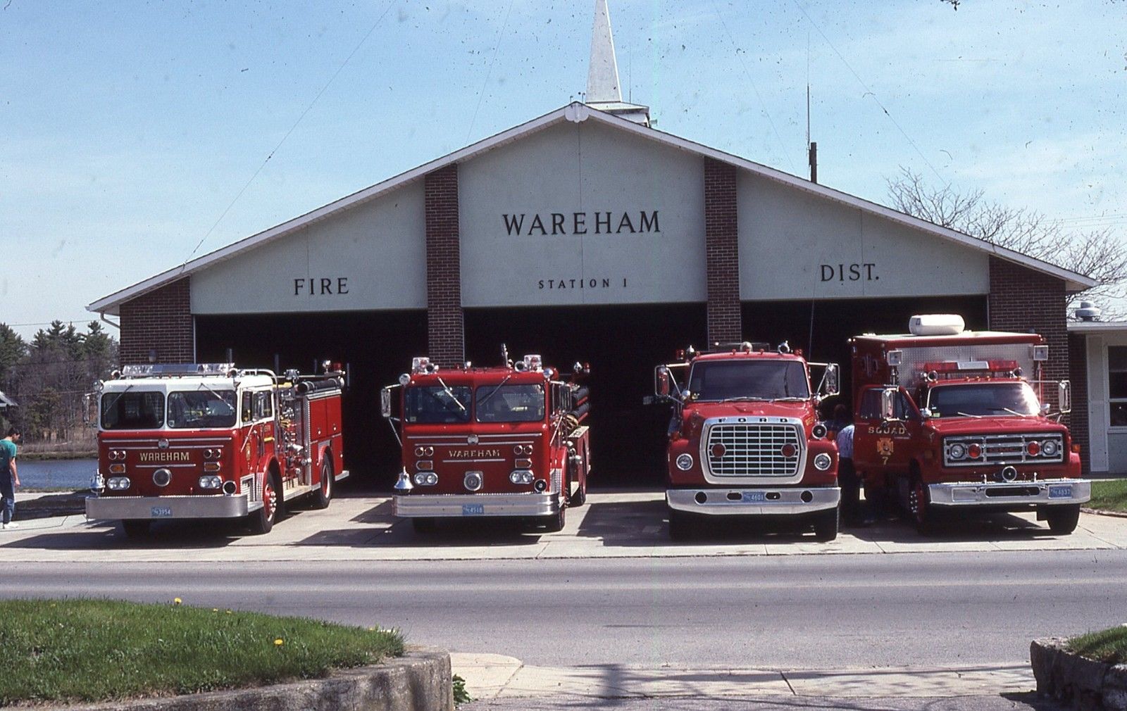 Wareham Fire department equipment line up in front of firehouse at Wareham, MA. Taken 05/02/1990.