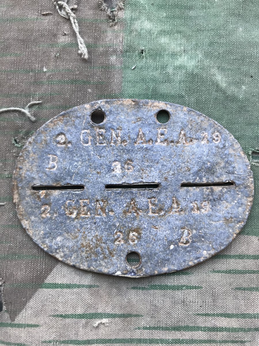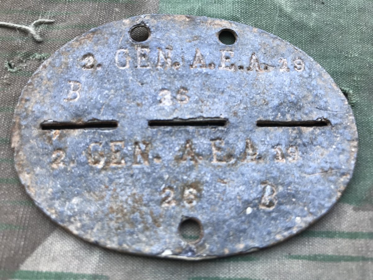 Жетон цинковый, расслоился, не важно видно, 2. GEN. A.E.A. 19 B личный номер 26. 2 рота выздоравливающих 19 артиллерийского запасного дивизиона? Если нет, то поправьте. И если есть какая то дополнительная информация по жетону закинь. Спасибо.
