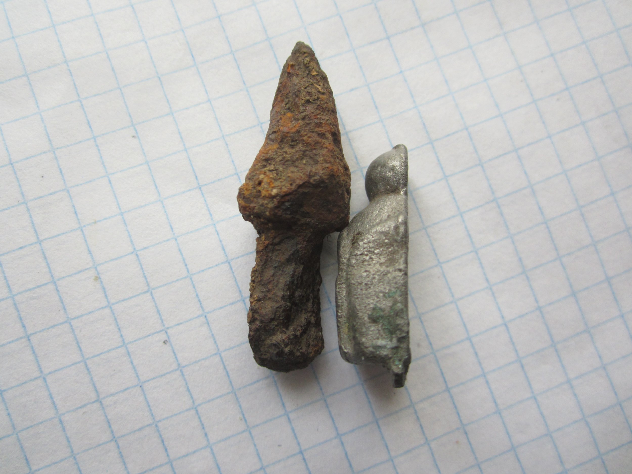Уважаемые камрады! Первый предмет, железный, в виде четырёхугольного наконечника, с остатком позолоты. Второй - из сплава белого металла. Сопутка - КР. Помогите идентифицировть. С уважением.