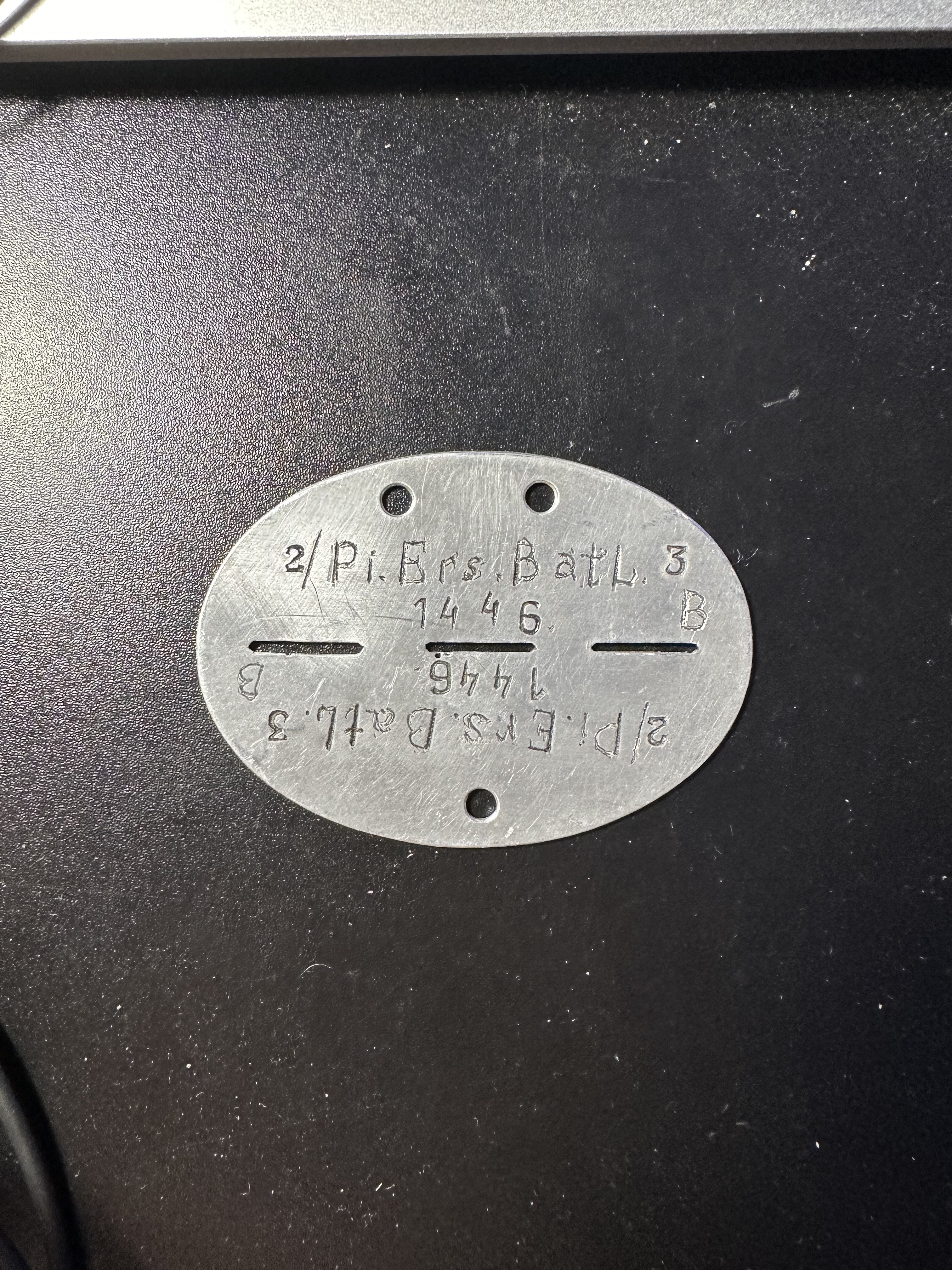 Добрый. 2. Kompanie Pionier- Ersatz Bataillon 3 2 рота 3 батальона подготовки и комплектования сапёров. В - 3 группа крови. https://www.lexikon-der-wehrmacht.de/Gliederungen/PionierErsBat/PiErsBat3.htm За оригинальность трудно сказать ,с самоделками , либо как в Вашем случае , нацарапанной инфой , тут надо в руках подержать. Я бы для себя спорные предметы не брал. Вот безвопросный оригинал этого бата https://reibert.info/lots/stab-pi.ers.btl.3.708621