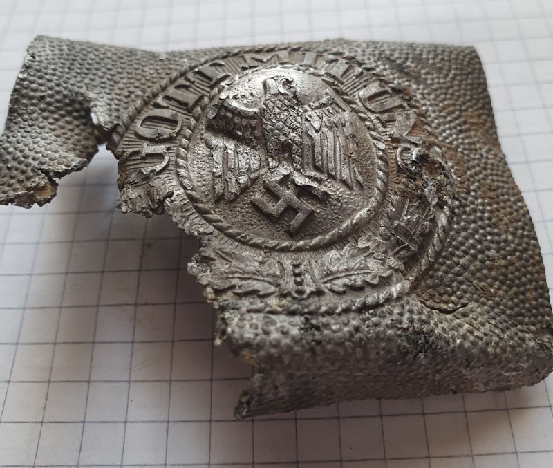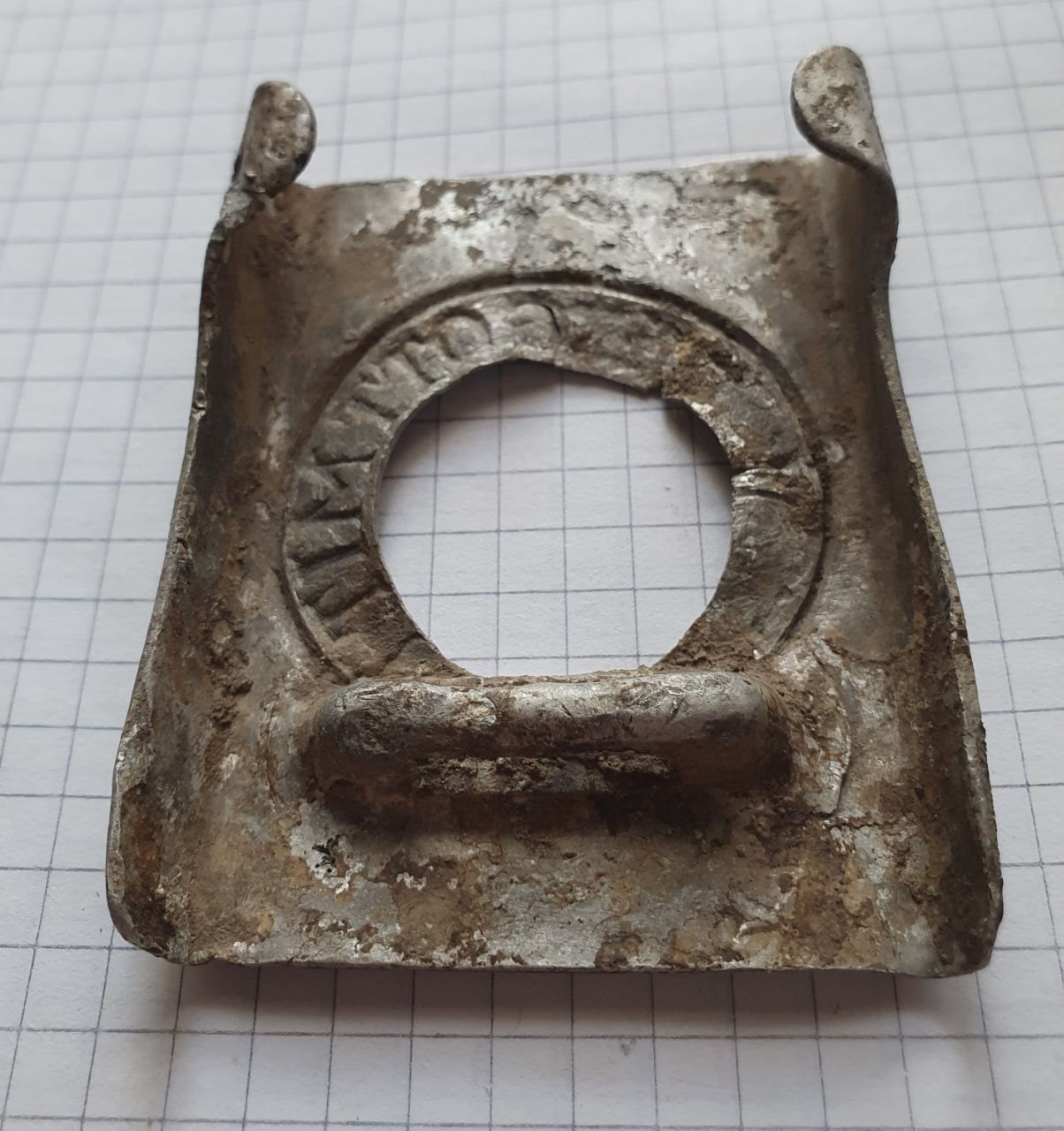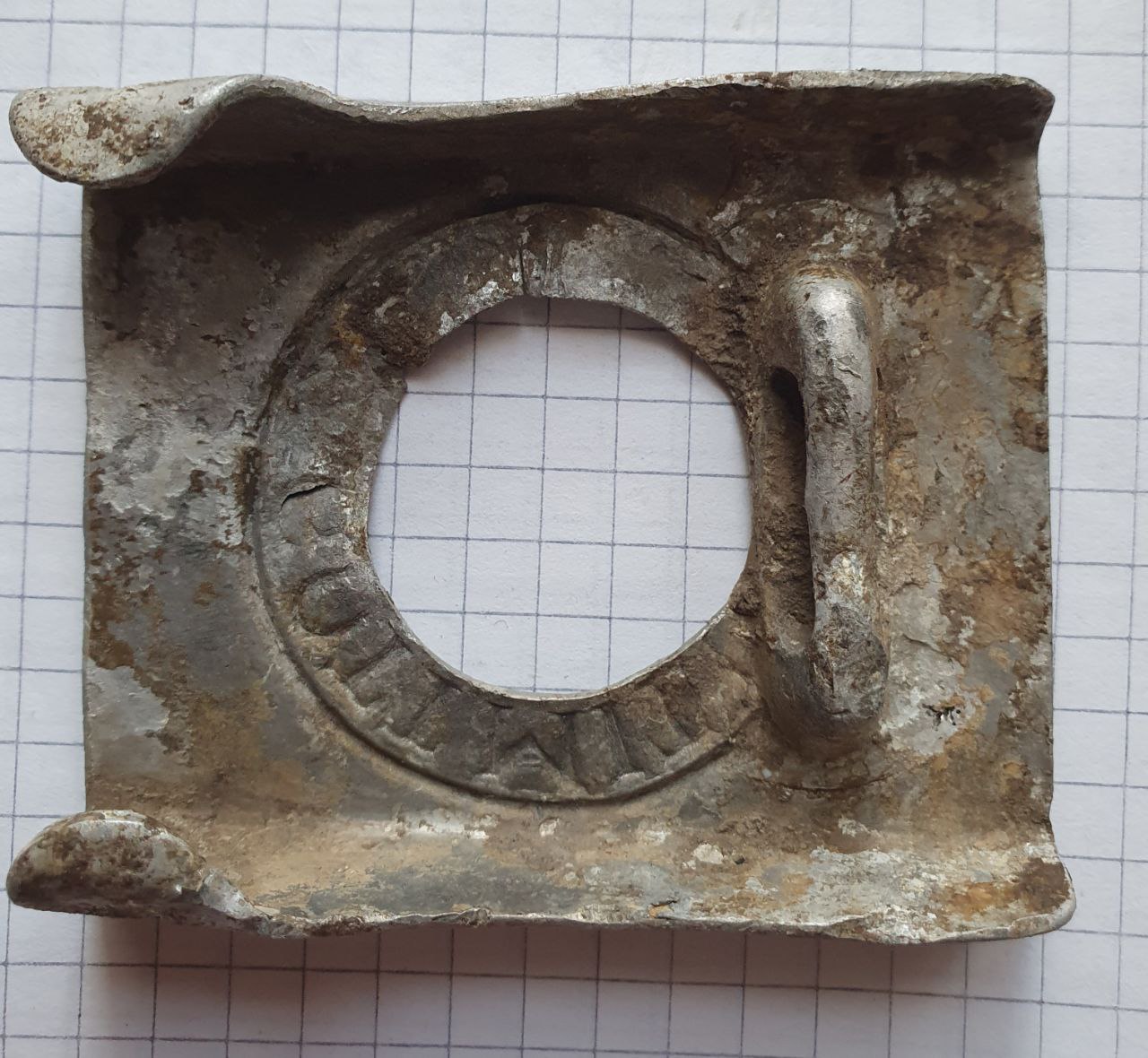 Нічого там не стояло. Видно що вирізали орла а круговий надпис "гот міт унс" і вінок просто видалили а потім розтовкли. Напис який ліквідували видно з внутрішньої сторони пряги.