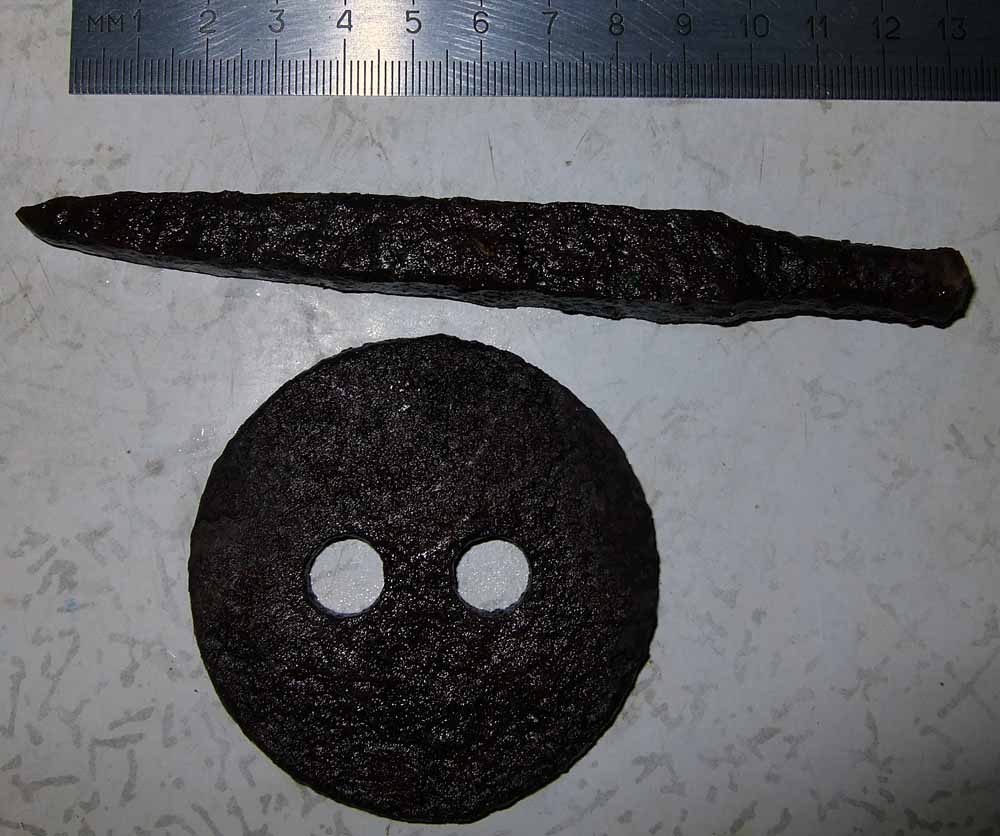 Нашел 2 железяки. Похожая на наконечник - это от с\х техники. А круглая штука, похожая на огромную пуговицу? От сбруи или тоже с\х?