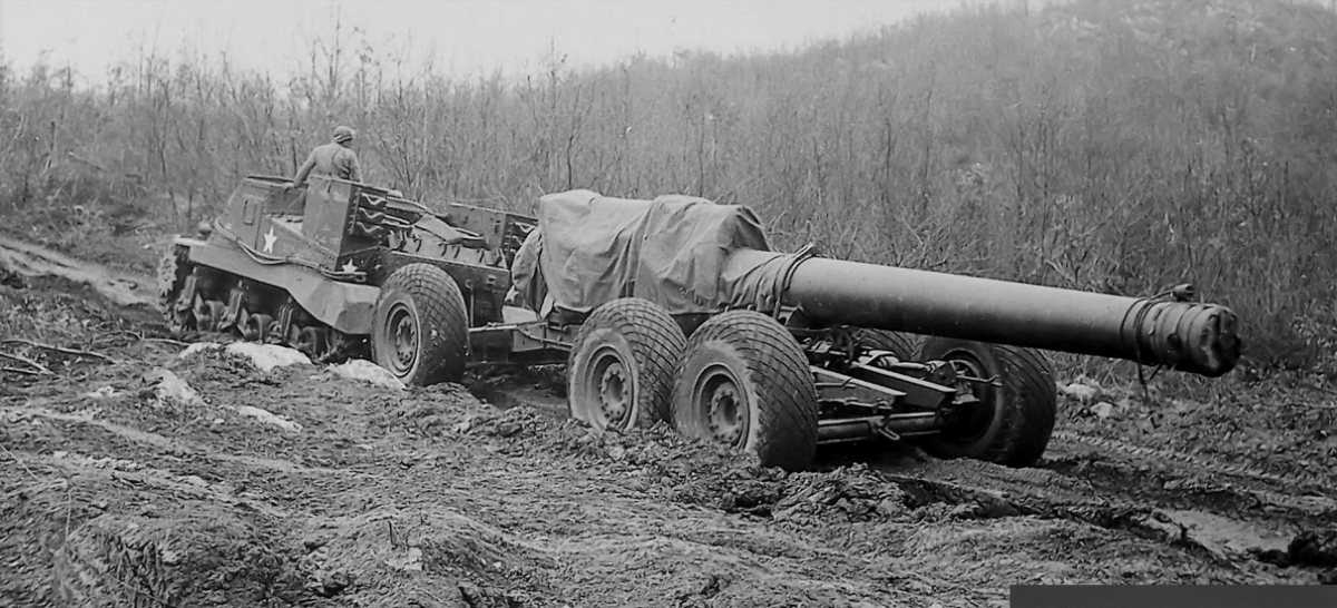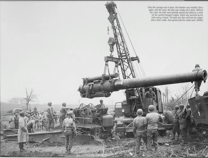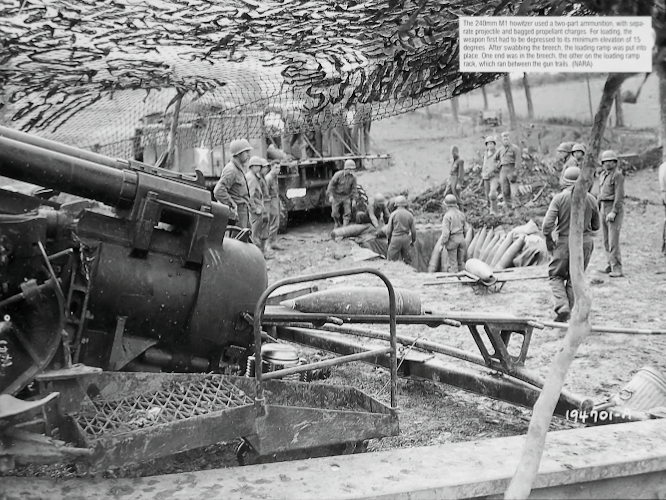 240-мм гаубица M1 - самая большая из гаубиц, используемых американской армией во время Второй мировой войны. Она была создана как мощное артиллерийское оружие для дальнего уничтожения укреплений противника и предназначалась для замены гаубицы модели 1918 года того же калибра, которая считалась уже устаревшей для использования в современной войне. После длительных испытаний (с 1940 года) в начале 1943 года новая гаубица была принята на вооружение. В то время она могла стрелять самым тяжелым снарядом из всех, что состояли на вооружении полевой артиллерии США, а именно 360-фунтовым снарядом на дальность превышающей 14 миль. Орудие перевозили в разобранном виде на двух платформах: на одной размещался ствол весом 26 000 фунтов (около 12,1 тонны), на второй – лафет весом 36 000 фунтов (около 16,3 тонны). Для транспортировки первоначально использовался гусеничный 38-тонный тягач М-6, позже тягач М-10. В боевое положение гаубица собиралась с помощью крана М2 (для окапывания использовался прицепной грейфер M16). Установка гаубицы в боевое положение и перевод её в походное положение было довольно сложной операцией и требовалось от 1 до 2 часов времени. Обслуживающая команда состояла из 25 человек, плюс водители транспортных средств. После Второй мировой 240-мм. гаубица М1 использовалась армией США в Корейской войне. В качестве орудия береговой обороны она все еще используется Тайванем и принимала участие в столкновении с Китайской Народной Республикой в 1958 году. на первом фото можно видеть как тягач М10 тянет за собой прицеп с 240-мм стволом. на четвертом - два артиллериста, несущие контейнер с зарядом весом около 53 кг.