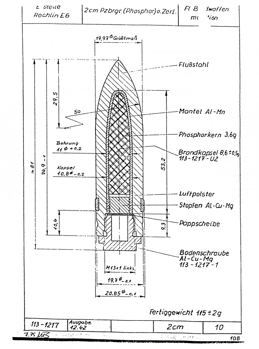 По 20мм снарядику: Мне попадались двух видов, снаружи одинаковые а внутри либо комора наполненная фосфором (тросер как пробка) либо фосфор заключенный в стальной герметичный контейнер.