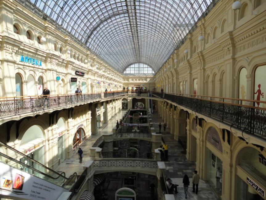 Протянувшись на четверть километра вдоль кремлевской стены, здание ГУМа замыкает Красную площадь с востока, архитектурой своих фасадов (декорированных граненым рустом) перекликаясь с Кремлем и Историческим музеем. Очень много лавок торгующих сувенирами...