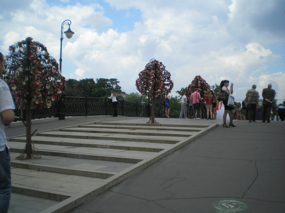 После Третьяковки пошли просто и тупо прямо и вышли на набережную, где и увидели шедевр от Царетели (памятник Петру I). По реке фонтаны. На мосту деревья металлические увешанные замками от молодоженов.