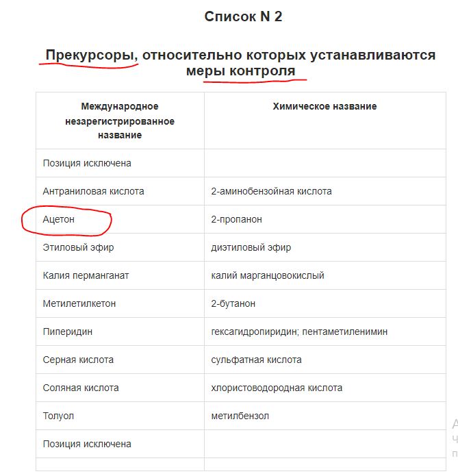 Вещества, которые содержат не менее чем 50 процентов таких прекурсоров, как ацетон, этиловый эфир, толуол, и 80 процентов таких прекурсоров, как метилетилкетон, подлежат тем же мерам контроля, что и прекурсоры. Джерело: https://www.medsprava.com.ua/article/1126-prekursory-perechen-utverjdennyh-v-ukraine-rus