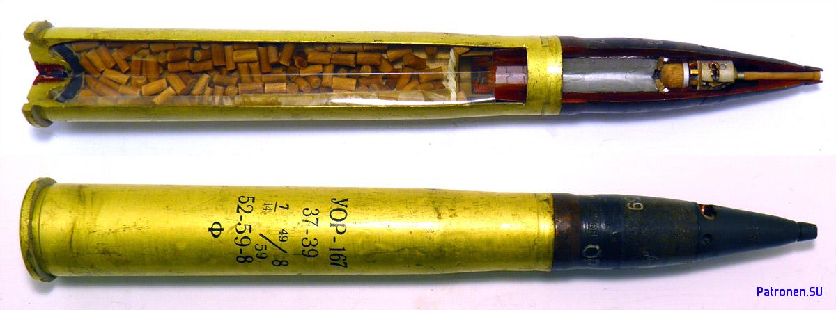 УОР-167 - Осколочно-трассирующая граната с взрывателем МГ-37 37-39 37мм автоматическая зенитная пушка обр. 1939г. 7/7 СВ 20/40 Р.УФ порох марки 7/7 свежей выделки 20 партия 1940г. выпуска, Р.УФ данные о заводе-производителе пороха 57-41-34 - 57 партия сборки выстрелов, год сборки 1941г., 34 центральная база и склад боеприпасов(г. Рыбинск Ярославской области) где произвели сборку выстрела