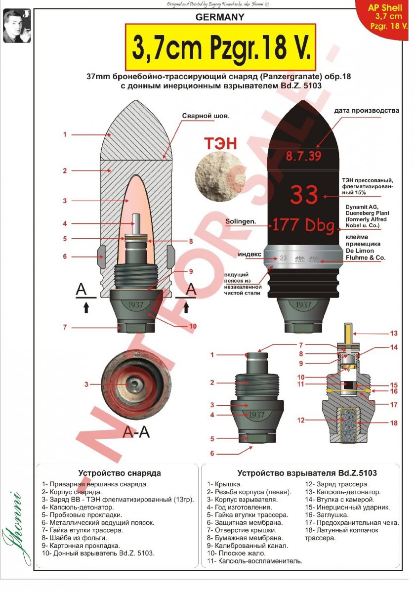 У Вас в руках 3,7 Pz.Granate 18 / (Üb.?) от Flak 18/36. наполнен Nitropenta-15(?)...учебный (Üb.) пустой.