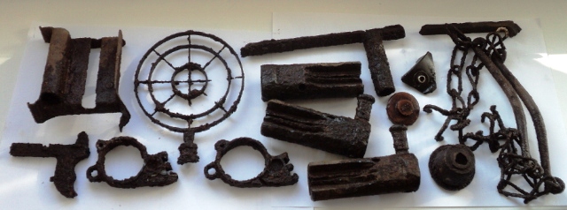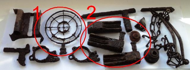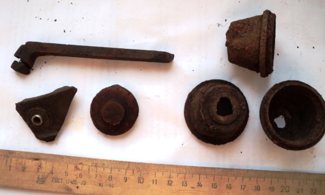Первая пластмассовая деталь, что-то знакомое. К сожалению развалилась. Второй обломок с гнездом с надписью ANTENNE APPARAT. Третий кусок резины с надписью HESS. И четвертый предмет попался в количестве. Конус с резьбой и стеклышком на торце. Жаль на всех трех разбито или оплавлено. Может от фото. Рядом с одним найден футляр из фольги с надписью Agfa. Подскажите по этим предметам.