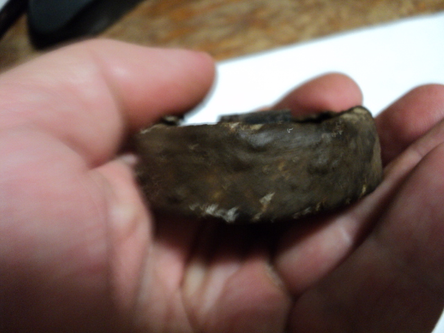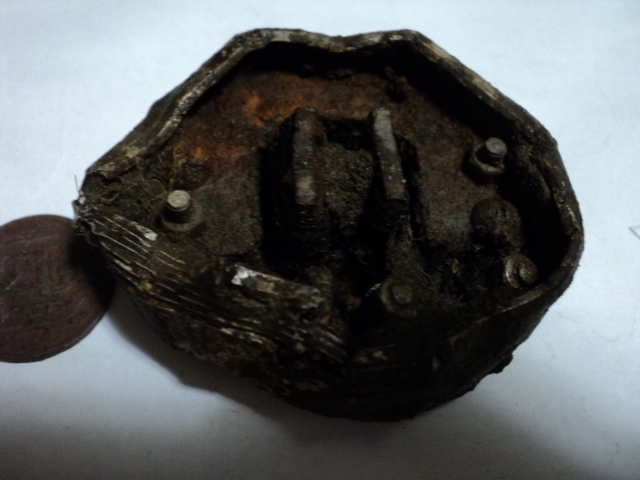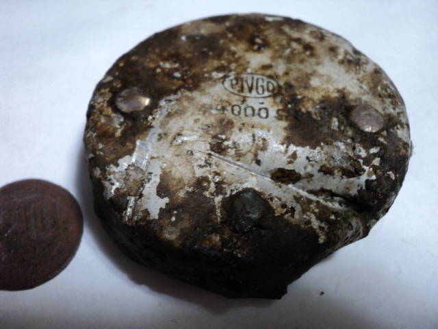 Вот остатки такого устройства, похожего на таблетку от наушника, только сильно помятую. Корпус алюминий, клепки латунь или бронза. Есть буквы. Что за прибор?