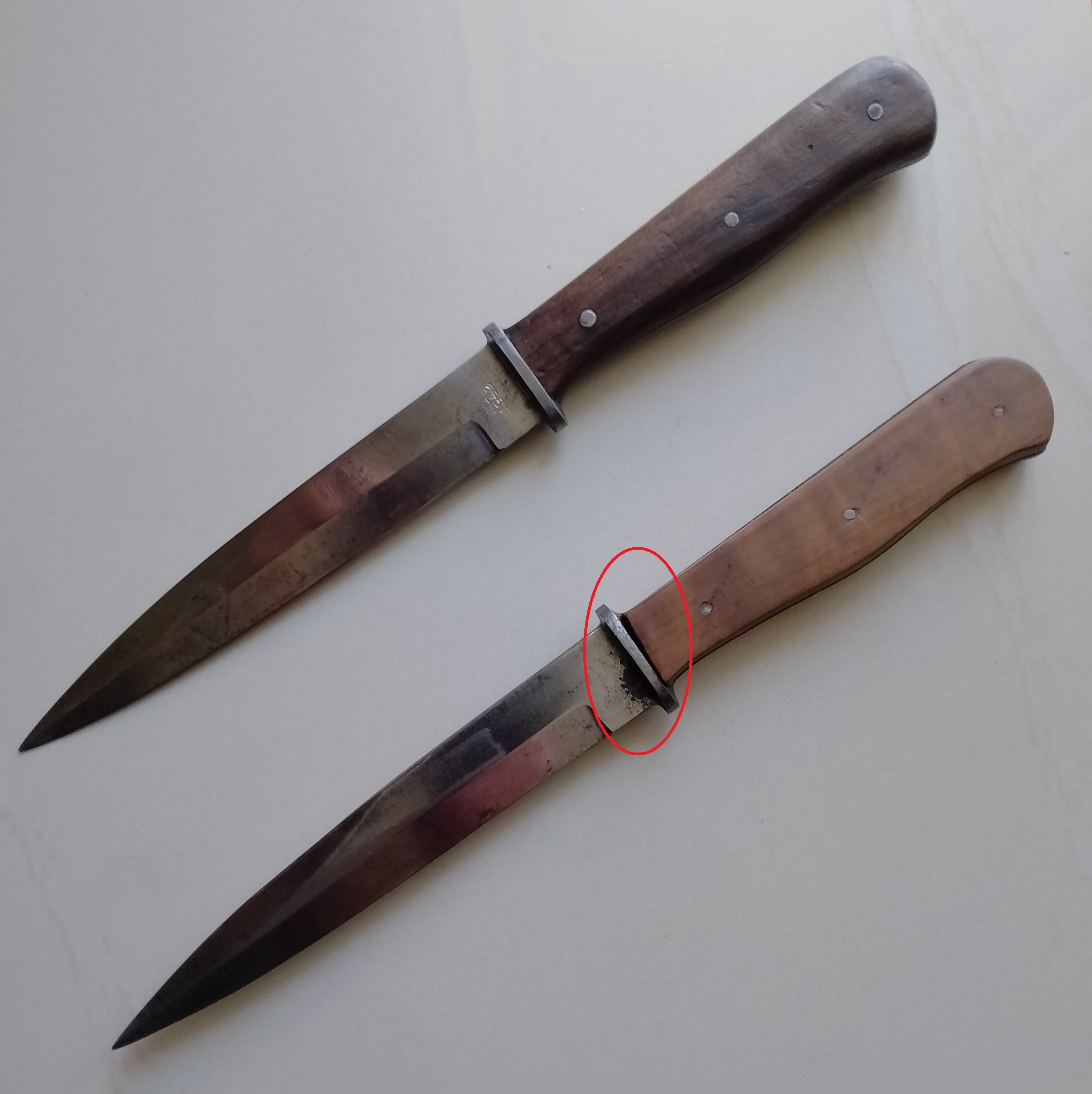 Согласен с тем Сергеем, что с ножами всё в порядке и неклеймёный по ряду признаков 9 к 1, что Infanteriemesser42 от E.&F. Hörster Co., Solingen. К вопросу о примыкании щёчек рукояти на оригинальных Infanteriemesser42. Они не всегда идеально подходят к телу ножа и встречаются довольно грубые подгонки. К тому же, у некоторых производителей попадаются щёчки разного цвета/тона на одном ноже (последнее фото), что, в данном случае (не всегда) является одним из косвенных признаков подлинности ножей от Karl Wolfertz & Söhne. Справедливости ради, скажу, что есть ножи и с идеальной подгонкой.