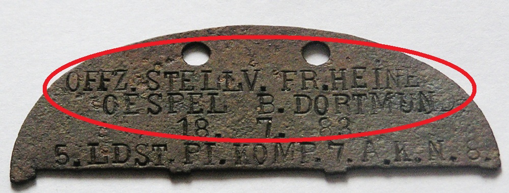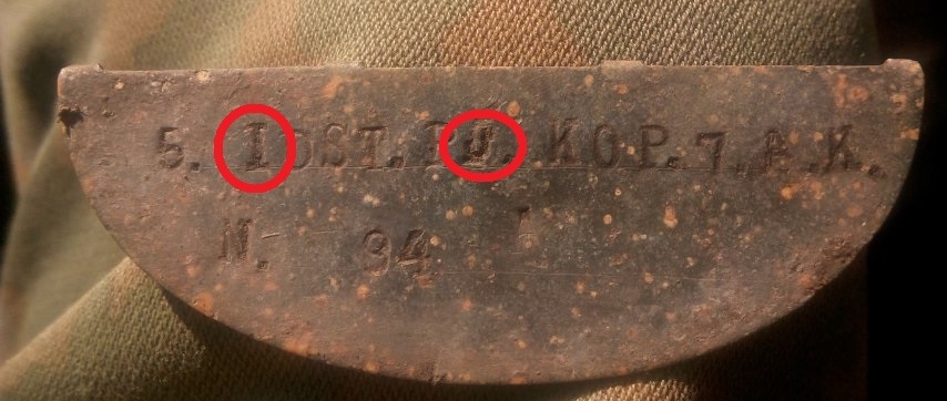 А половинка интересная, я бы сказал - уникальная! Похоже, что мастер был с большого бодуна... Набивка нелогичная. Во первых - буквы L и i непонятные Во - вторых - роту обозначает цыфра 5, а далше должно быть обозначение батальона или полка. Небыло в подчинение 7 корпуса отдельной роты. В - третих - даже слово Komp. набито с ошибкой... Но это скорее бонусс при продаже. Хорошая находка!