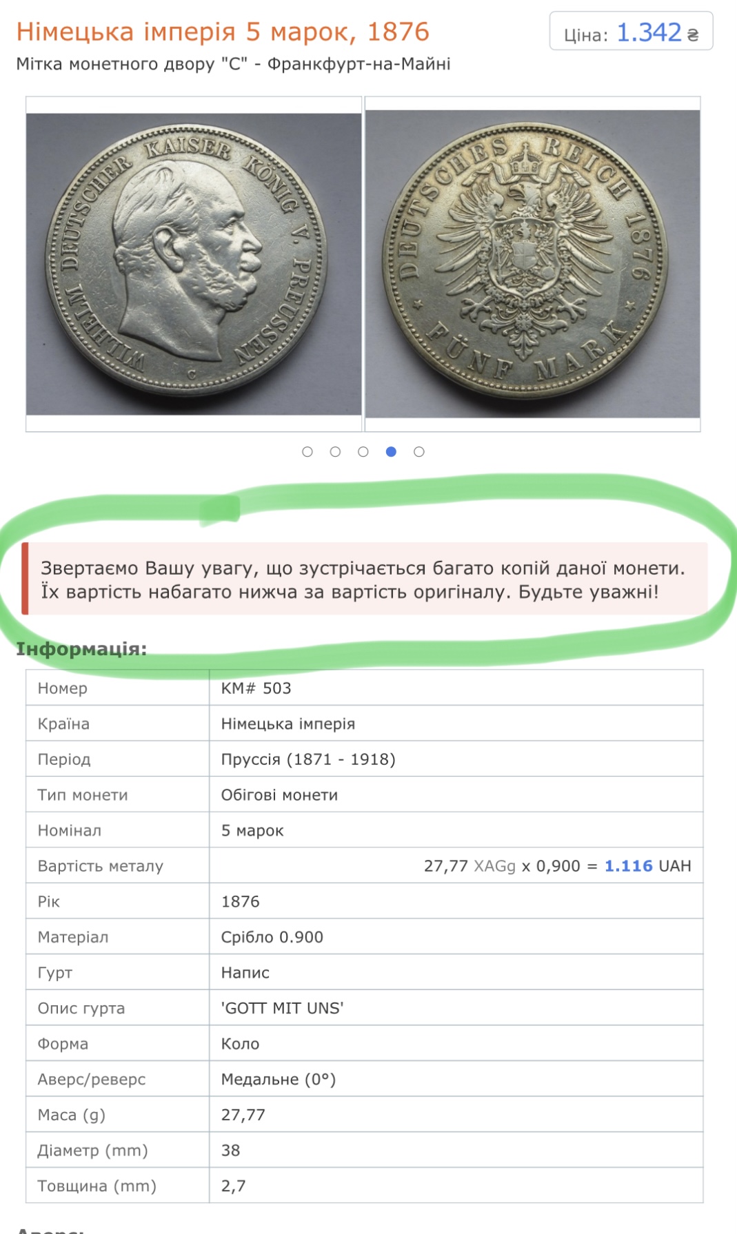 Доброго дня Підкажіть будь ласка, яка вага повинна бути оригінальной монети ? Та яка приблизна ціна за такий стан монети ???