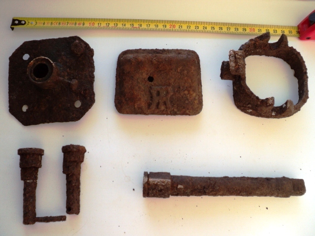Подскажите по этим выкопанным на немецких позициях предметам: 1. Подставка с остатками краски 2. Крышка с эмблемой, металл толстый. 3. Непонятная рамка с вырезами. 4. Две одинаковых детали 5. Стержень сложной формы.