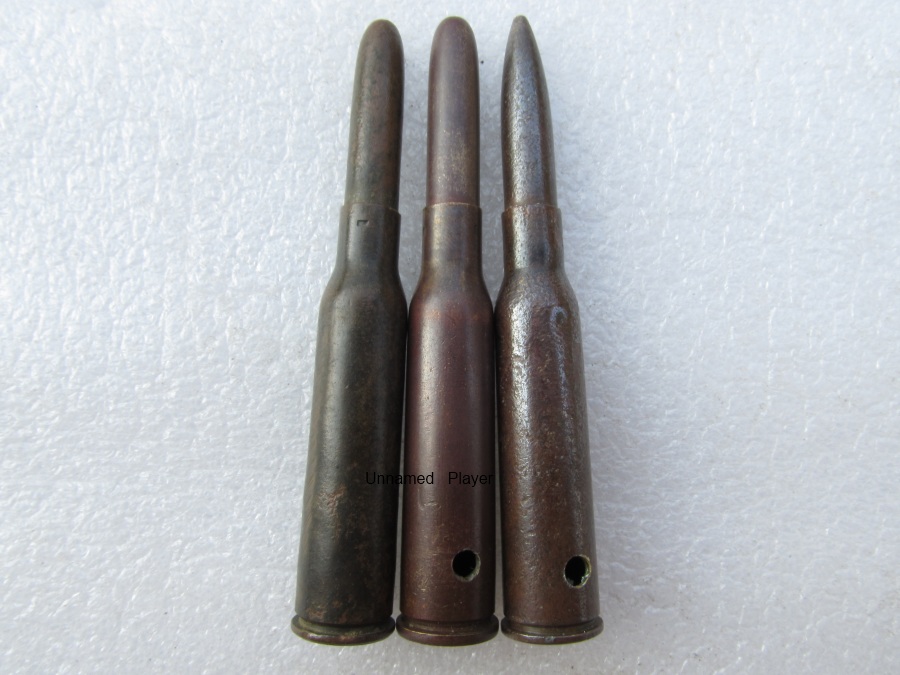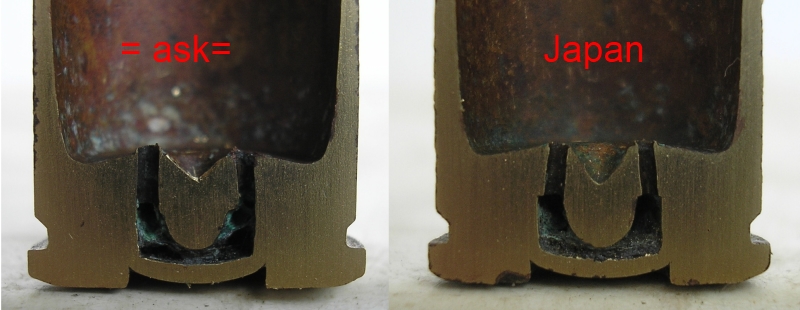 Для сравнения внутренней конструкции гильзы был выбран "чистокровный" японский патр с тупоконечной пулей (двойное кернение капсюля, лакированный капсюль). Внешне патроны ничем не отличались визуально, пули тоже. Гильза "японца" была разрезана и приведена на фото под обозначением "Japan". Особых различий в конструкции гильзы не обнаружилось.