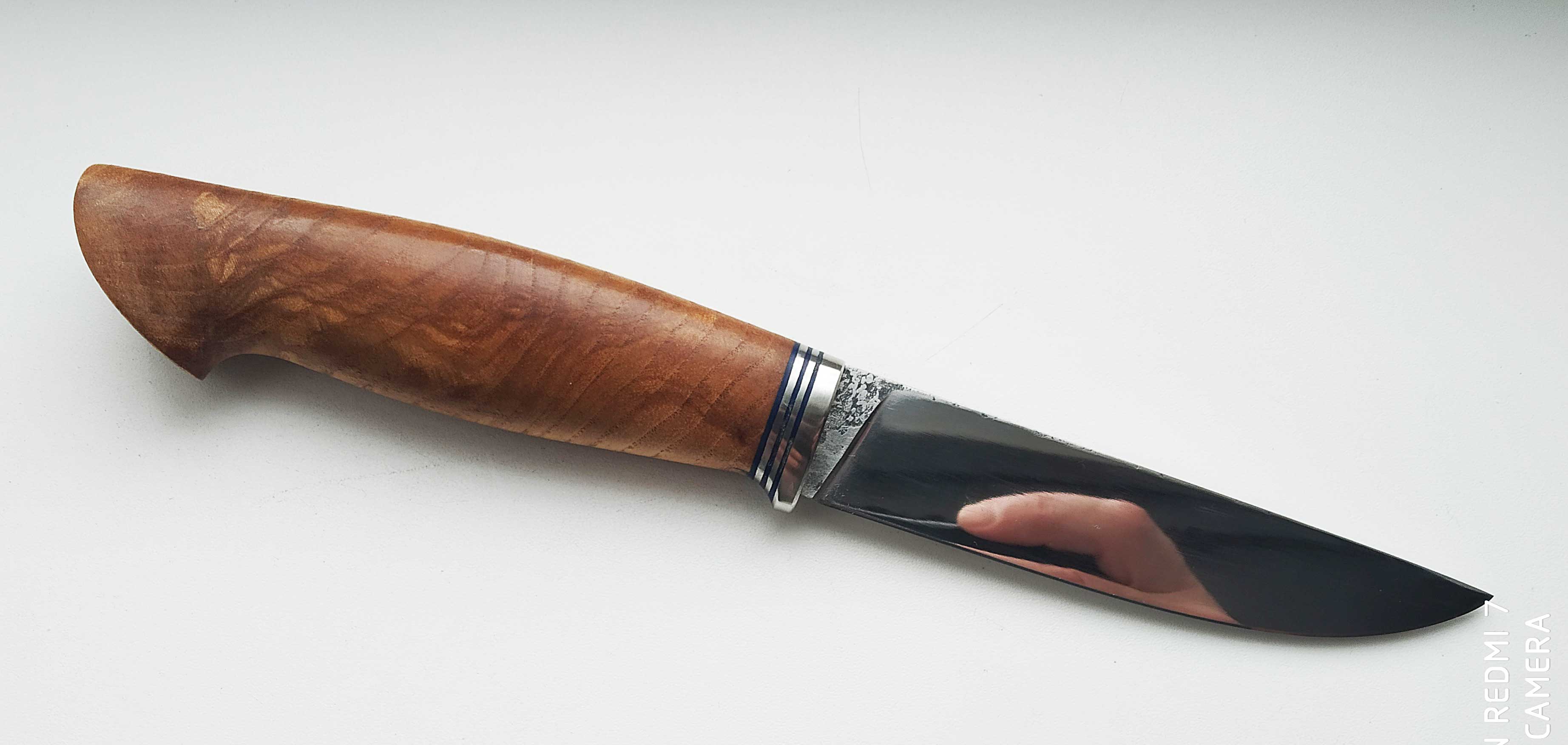 Сталь 65х13, длинна клинка 115 мм. Твердость 56-57 ед, длинна рукояти 125 мм, ширина клинка 23 мм, в обухе 3.3 мм больстер из нержавейки и синей G10. рукоять ясень поперечный спил. Материал клинка нержавеющий. Ножен нет.