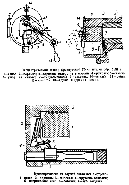 Крайне любопытное орудие особенно меня привлекало в этой пушке тип затвора очень интересной конструкции. Об устройстве затвора следует сказать особо. Поршневой эксцентрический затвор или крановый был предложен Норденфельдом и впервые применен в 75-мм французской пушке 1897 г.