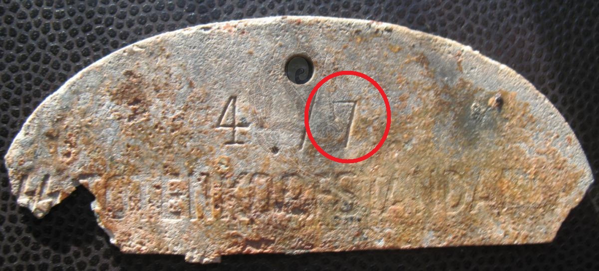 Да, жетоны SS-Totenkopf Standarte интересны тем, что набивка иногда делалась вопреки правилам. На жетоне я вижу надпись 7 / Kompanie SS-Totenkopf Standarte. Номер штандарта по всем законам должен был находиться здесь: Вот примеры: Но на жетонах этого образца, такое встечается только у SS-Totenkopf Standarte 5 А у SS-Totenkopf Standarte 4, 6 и 7 набивка нелогичная: Если бы жетон подняли в Карелии, то с уверенностью на 99% можно было предположить, что его носил солдат 6. SS-Gebirgs Division "Nord" (SS-Kampfgruppe "Nord", SS-Division "Nord"), по скольку основная масса SS-Totenkopf Standarte 7 (SS-Infanterie Regiment 7 (mot.) создала костяк этого подразделения. Но в Вашем случае никто этого не скажет...