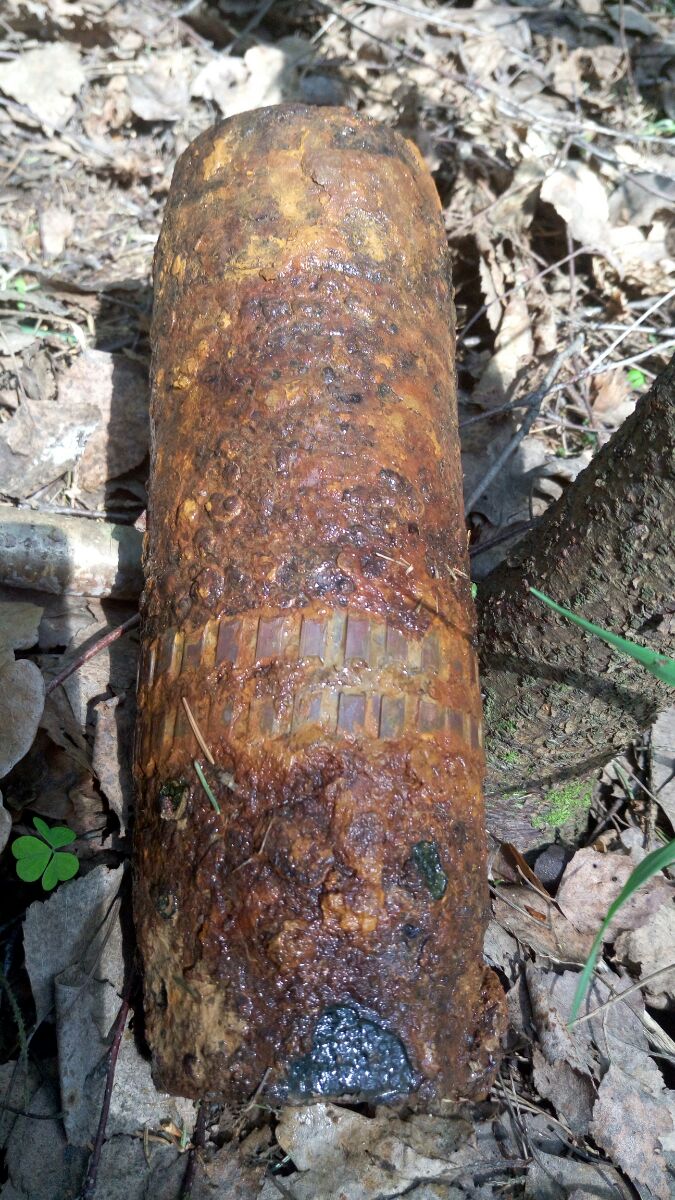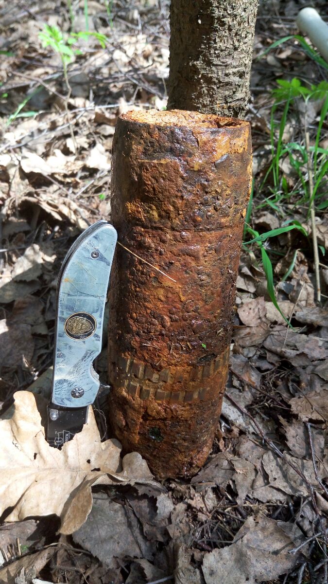 Два пояска, торчала строго жопой вверх, без башки - 76 мм вертикальная шрапнель от зенитки? Сверху забита глиной, внутрь не лазил, прикопал на месте. Самый главный вопрос - если взрыватель сработал, как может остаться в полной целости сам стакан? Или основной заряд не сработал, так и упал?