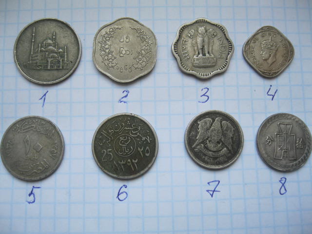 Добрый день! 3-10 рупий Индия, 4-1\2 Анны Британская Индия, 6-Саудовская Аравия, 7-10 пиастров Сирия. С ув.