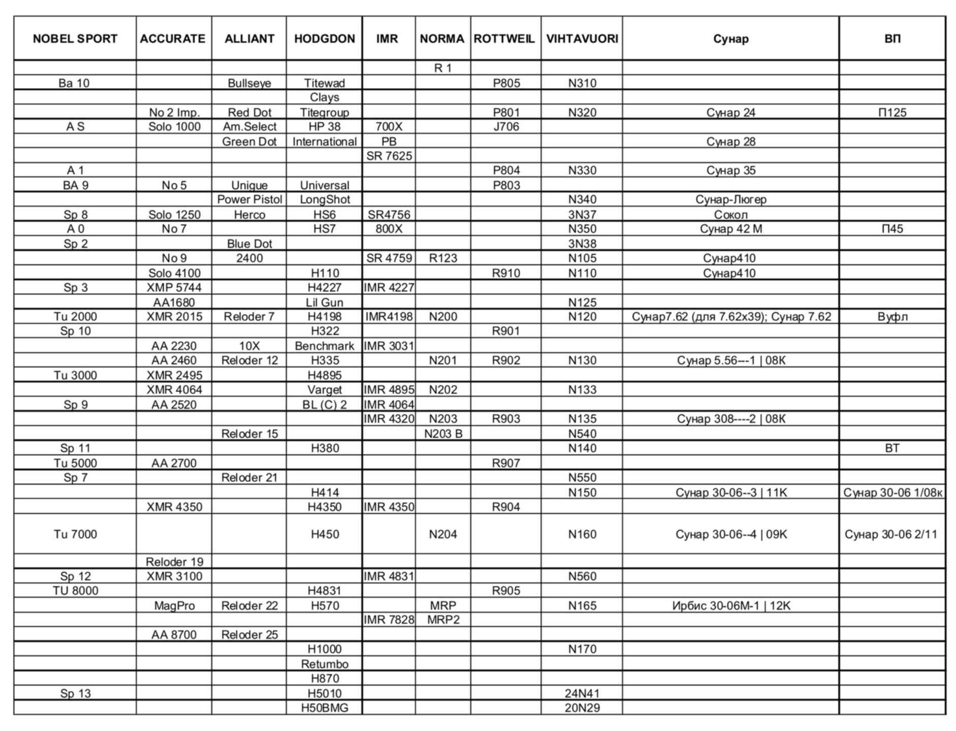 Пули для 9x18 ПМ Макаров Форт АПС ПП Скорпион : 1. Пуля 9x18 ПМ Макаров вес 5 грамм 75 грейн 1a. Пуля 9x18 ПМ Макаров вес 5 грамм 75 грейн ЭКСПАНСИВНАЯ 2. Пуля 9x18 ПМ Макаров вес 6,9 грамм 95 грейн 2a. Пуля 9x18 ПМ Макаров вес 6,9 грамм 95 грейн ТВЕРДЫЙ СПЛАВ 2b. Пуля 9x18 ПМ Макаров вес 6,9 грамм 95 грейн ЭКСПАНСИВНАЯ 3. Пуля 9x18 ПМ Макаров вес 8,7 грамм 130 грейн ТВЕРДЫЙ СПЛАВ Эта пуля 130 грейн на подходит для пистолета АПС. 4. Пуля 9x18 ПМ Макаров вес 8,2 грамм 124 грейн Тяжелая для дозвука 4. Пуля 9x18 ПМ Макаров вес 8,2 грамм 124 грейн ЭКСПАНСИВНАЯ Пуля 9x18 Макаров вес 75 грейн: 1. порох Nobel Sport 206sv 0,40 грамм 450м/с 500Дж 2. порох Nobel Sport 206sv 0,30 грамм = сверхзвук 3. порох Nobel Sport 206v 0,30 грамм = сверхзвук 4. порох Nobel Sport A1 0,30 грамм = сверхзвук 5. порох Nobel Sport D20 0,30 грамм = сверхзвук 6. порох Тахо CSB-2 0,30 грамм = сверхзвук Пуля 9x18 Макаров вес 95 грейн: 1. порох Nobel sport ba10 0,20 грамм = сверхзвук 2. порох Nobel Sport 206sv 0,22 грамм = сверхзвук 3. порох Nobel sport ba9 1/2 0,22 грамм = сверхзвук 4. порох Nobel Sport AS 0,25 грамм = сверхзвук 5. порох Nobel Sport 206v 0,25 грамм = сверхзвук 6. порох Nobel Sport D20 0,25 грамм = сверхзвук 7. порох Nobel Sport A1 0,25 грамм = сверхзвук 8. порох Nobel Sport Ba9 0,28 грамм = сверхзвук 9. порох Nobel Sport Ba7 1/2 0,30 грамм = сверхзвук 10. порох Nobel Sport A0 0,30 грамм = сверхзвук 11. порох Тахо CSB-2 0,25 грамм = сверхзвук Пуля 9x18 Макаров вес 124 грейн: 1. порох Nobel Sport 206sv 0,13 грамм = дозвук 2. порох Nobel Sport 206v 0,17 грамм = дозвук 3. порох Nobel Sport D20 0,17 грамм = дозвук 4. порох Nobel Sport A0 0,18 грамм = дозвук 5. порох Hodgdon Titegrоup 0,20 грамм = дозвук 6. порох Тахо CSB-2 0,15 грамм = дозвук Пуля 9x18 Макаров вес 130 грейн: 1. порох Nobel Sport 206sv 0,14 грамм = дозвук 2. порох Nobel Sport 206v 0,18 грамм = дозвук 3. порох Nobel Sport D20 0,18 грамм = дозвук 4. порох Nobel Sport A0 0,20 грамм = дозвук 5. порох Hodgdon Titegrоup 0,16 грамм = 210м/с 6. порох Hodgdon Titegrоup 0,20 грамм = 270м/с 7. порох Тахо CSB-2 0,16 грамм = дозвук