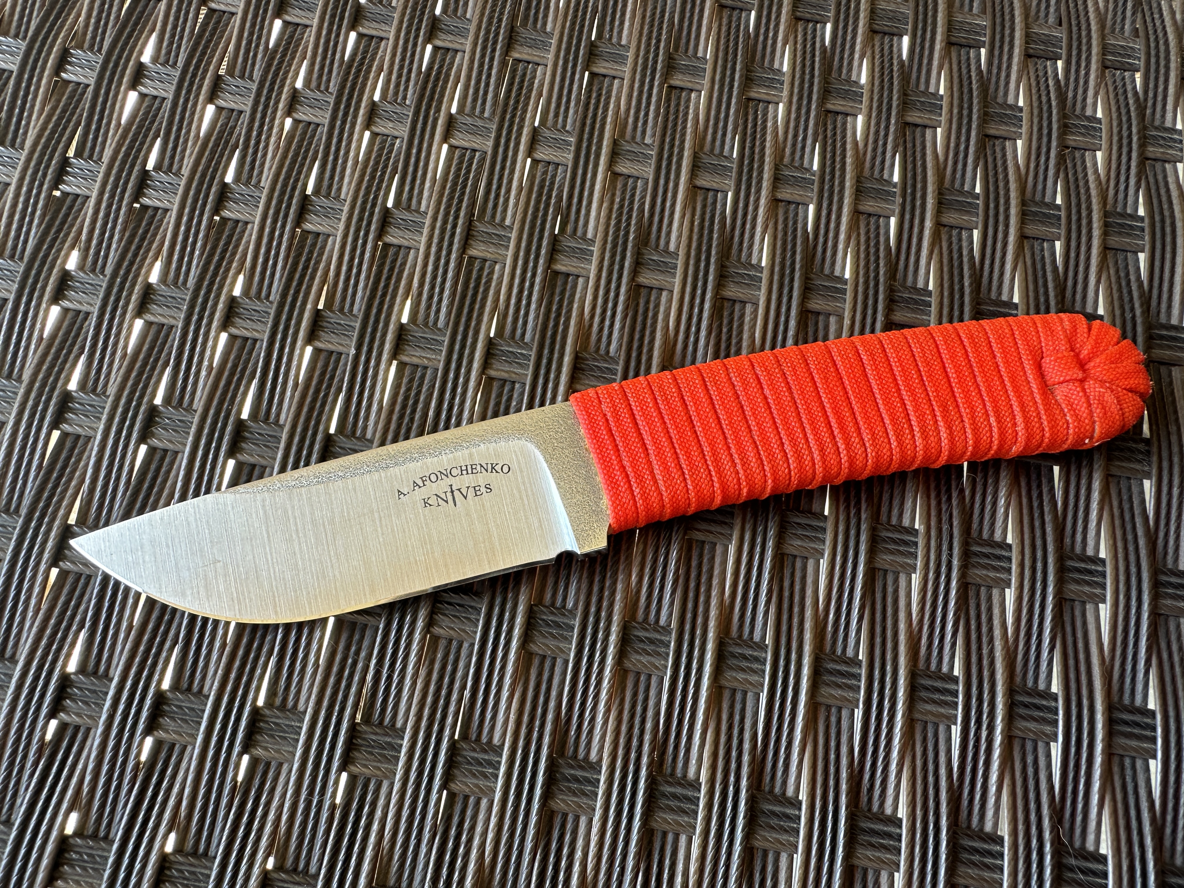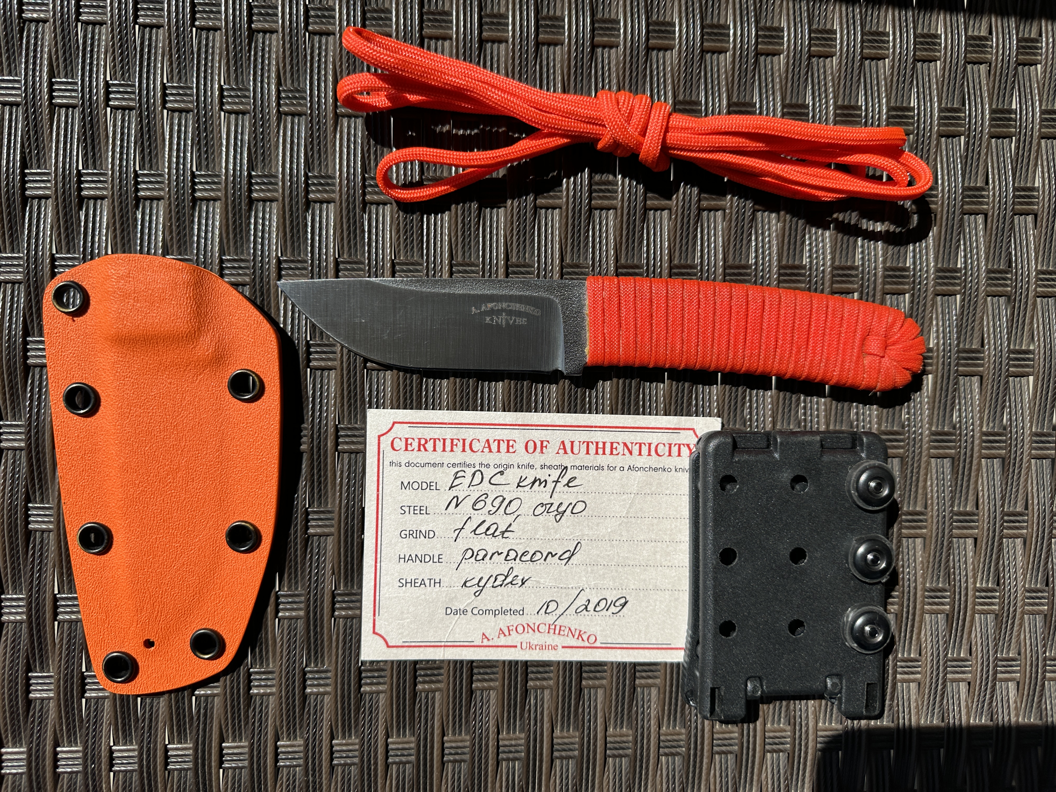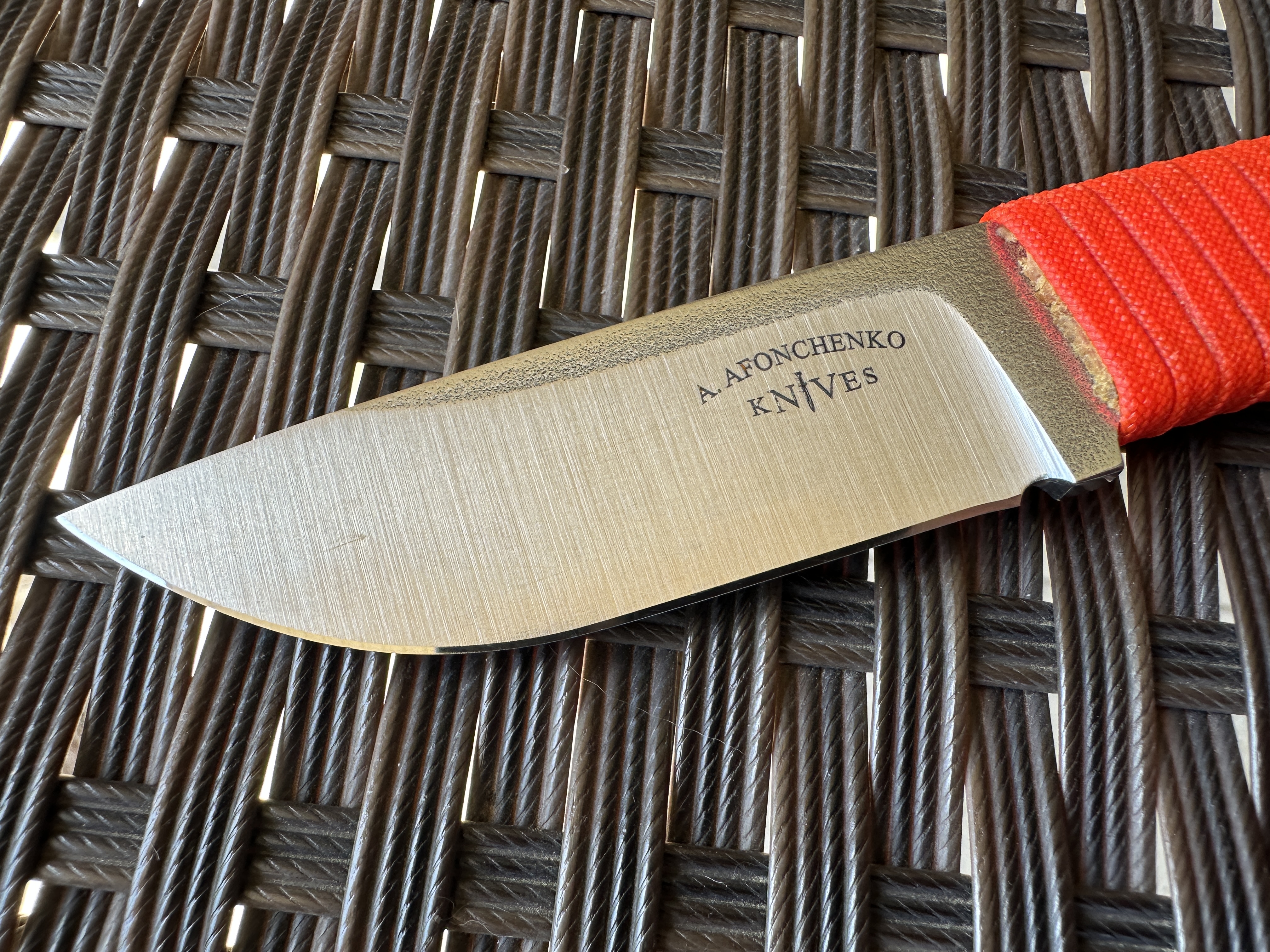 А. Афонченко Afonchenko Knives Нож б/у, один раз затачивался профессионально. Был в легком поюзе, без тяжелой работы. Царапин и сколов нет. Есть не большие потертость от кадекса. Оранжевый паракорд на рукоятке проклеен чуток видно клей. Сертификат соответствия в наличии. Цена 4100 грн. Оплата по договору, пересылка за счет покупателя. Общая длина: 18,5 см Длина клинка: 7,8 см Сталь клинка: N690 Сатин и битый лед. Ножны кайдекс + крепление